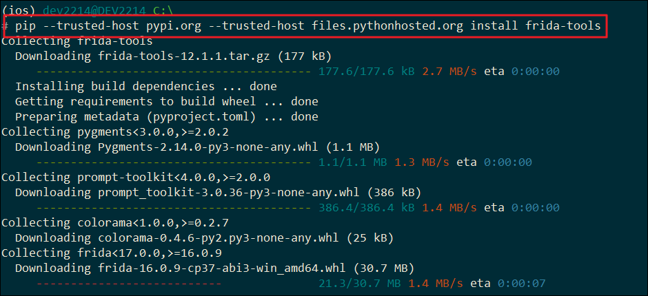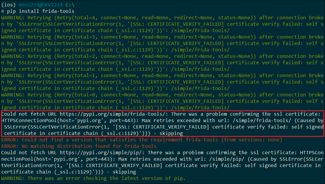 pip --trusted-host pypi.org --trusted-host files.pythonhosted.org install frida-tools