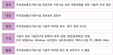이러한 기술적 점검에 대한 어려움을 해소하고, 주요정보통신기반시설 담당자들의 이해를 돕기 위해 과학기술정보통신부와 한국인터넷진흥원에서는 전체 313개 기술적 점검항목에 대한 가이드를 발간하게 되었다.