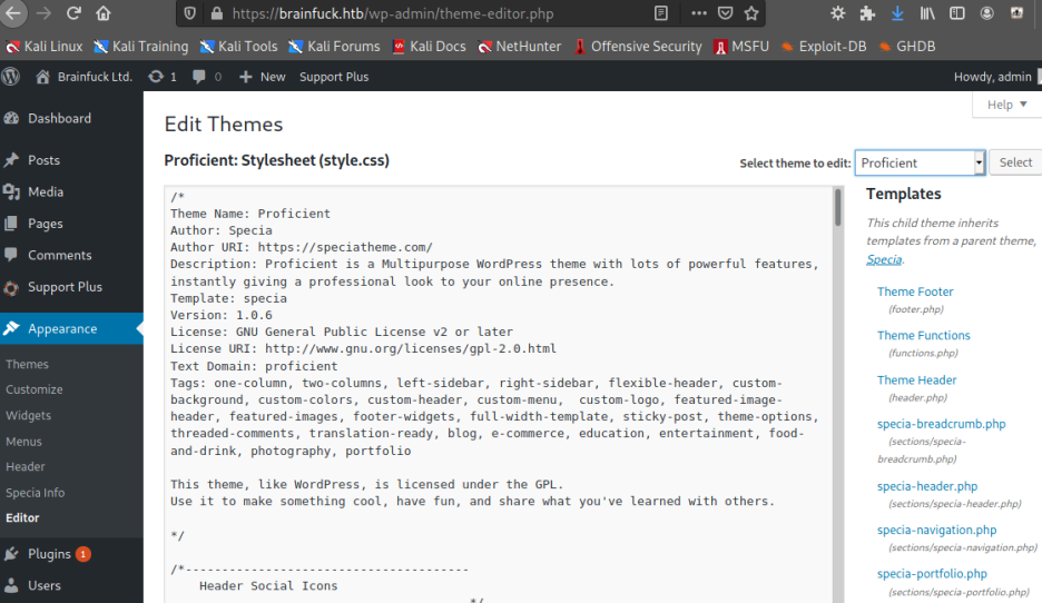 | - https://brainfuck.htb/wp-content/themes/proficient/style.css?ver=4.7.3, Match: 'Version: 1.0.6'