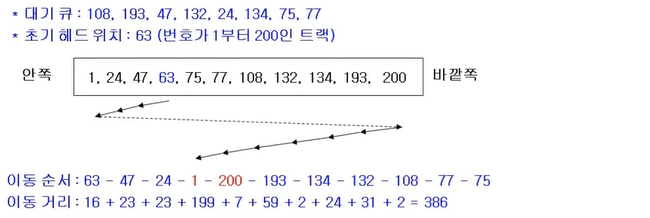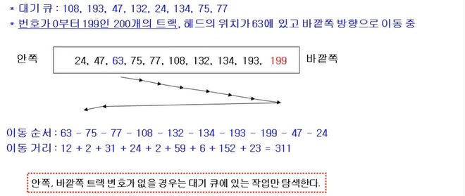 안쪽에 더 이상의 요청이 없으면 헤드는 가장 바깥쪽의 끝으로 이동한 후 다시 안쪽으로 이동하면서