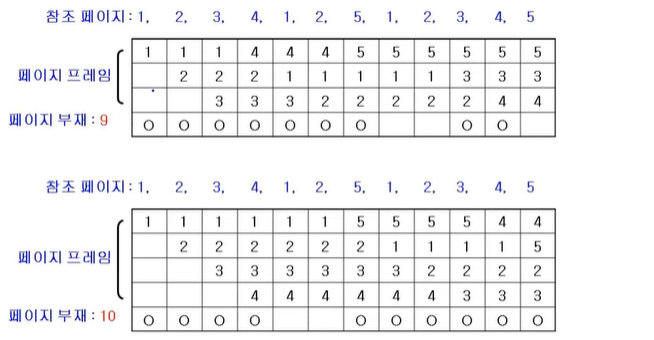 - 페이지 프레임 수가 증가하면 페이지 부재가 더 증가