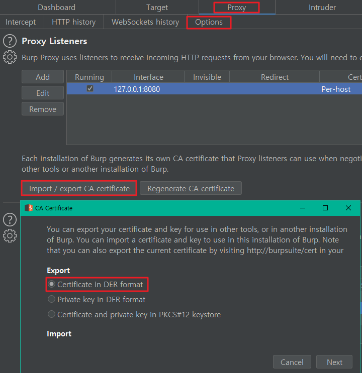 Proxy > Options > Provy Listners > Import / export CA certificate