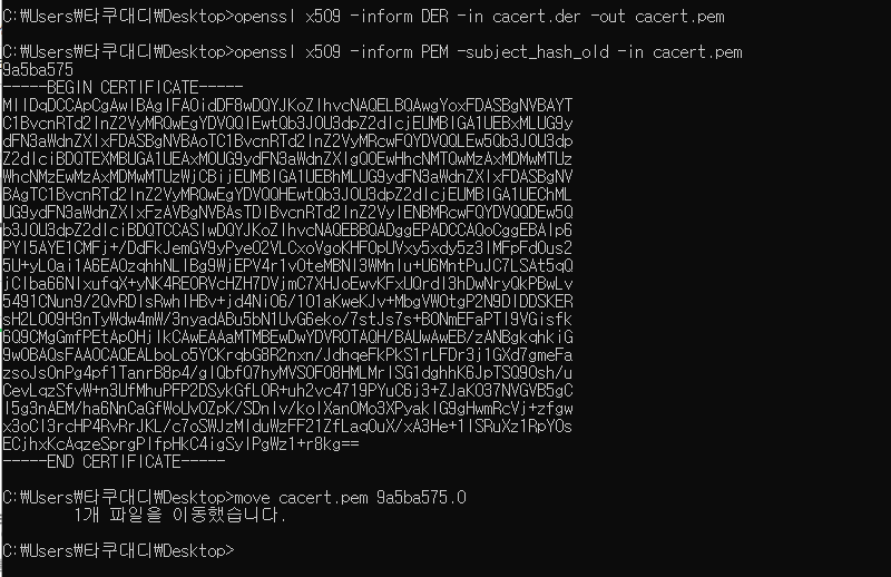 (2) 확장자명을 cacert.der에서 cacert.crt로 변경 후