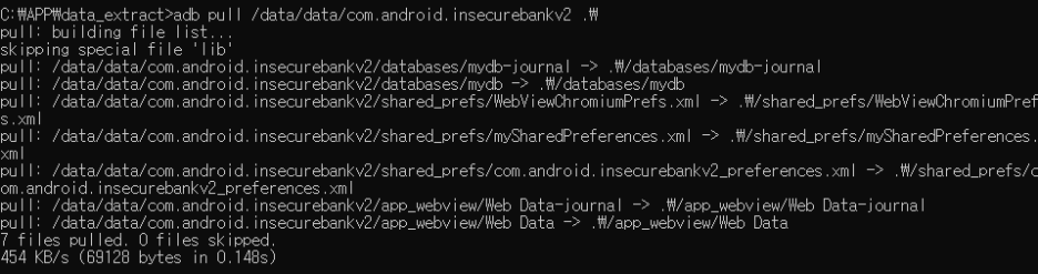 C:> adb pull /dat/data/com.android.insecurebankv2 .\