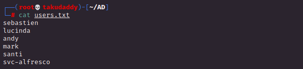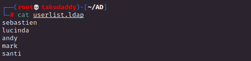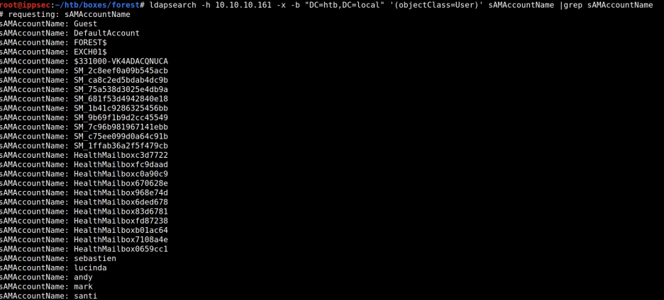 # ldapseach -h 192.168.137.131 -x -b "DC=htb, DC=local" '(objectClass=User)' sAMAccountName | grep sAMAccountName | awk '{print $2}'
