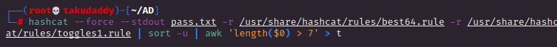 # hashcat --force --stdout pass.txt -r /usr/share/hashcat/rules/best64.rule -r /usr/share/hashcat/rules/toggles1.rule | sort -u | awk 'length($0) > 7' | wc -l