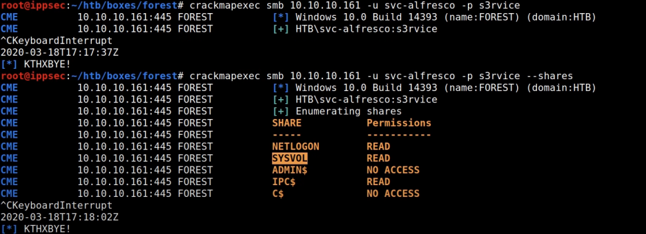 # crackmapexec smb 192.168.137.131 -u svc-alfresco -p s3rvice --shares