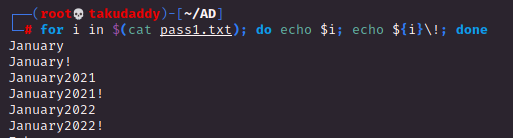 # for i in $(cat pass.txt); do echo $i; echo ${i}2021; echo ${i}2022; done