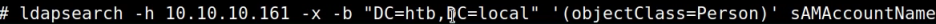 # ldapseach -h 192.168.137.131 -x -b "DC=htb, DC=local" '(objectClass=Person)' sAMAccountName