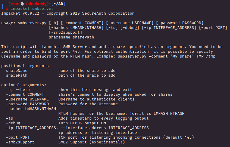 # impacket-smbserver takudaddy $(taku) -smb2support -user root - password toor
