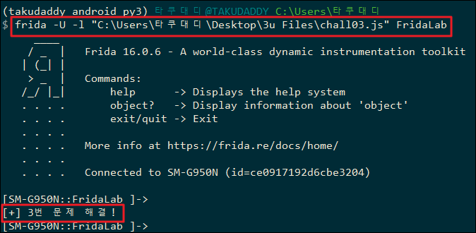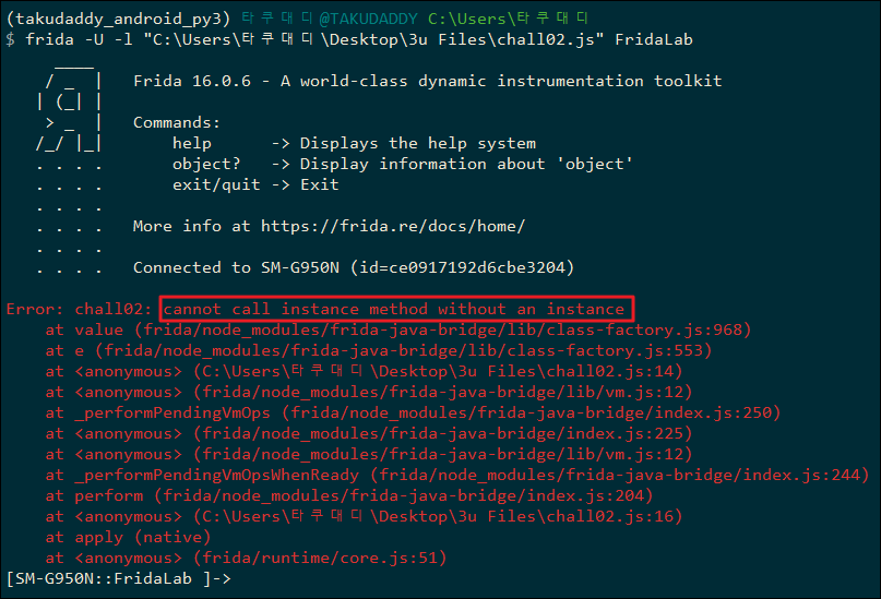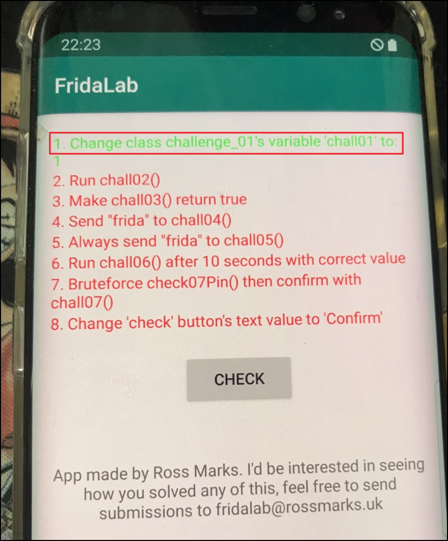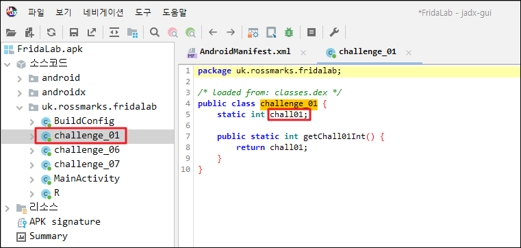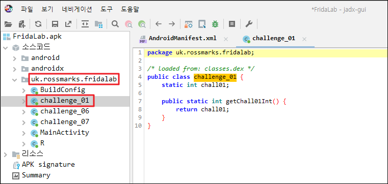 var chall_01 = Java.use("uk.rossmarks.fridalab.challenge_01"); // static 메서드를 찾을때는 Java.use API