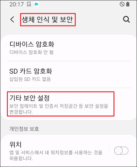 (3) 단말기의 "설정 > 생체 인식 및 보안 > 기타 보안 설정"