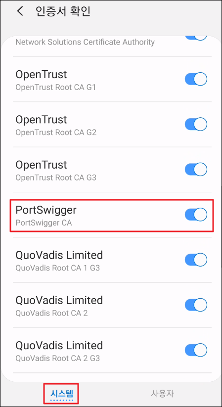 메뉴 내 "사용자" 탭에 설치된 버프 사용자 인증서가 보이고