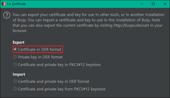 (1-1) 버프 Proxy > Options 메뉴에서 인증서 Export
