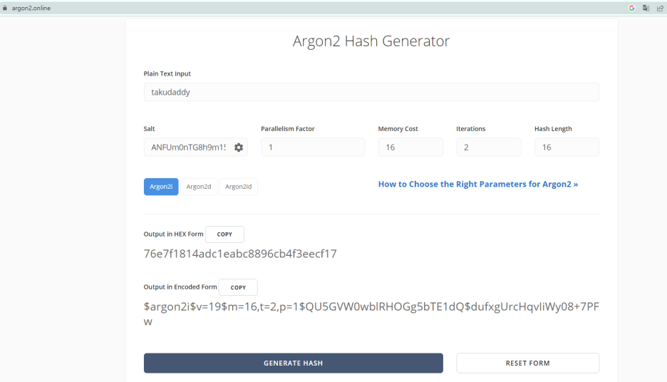 온라인 argon2 해시 생성기를 통해
